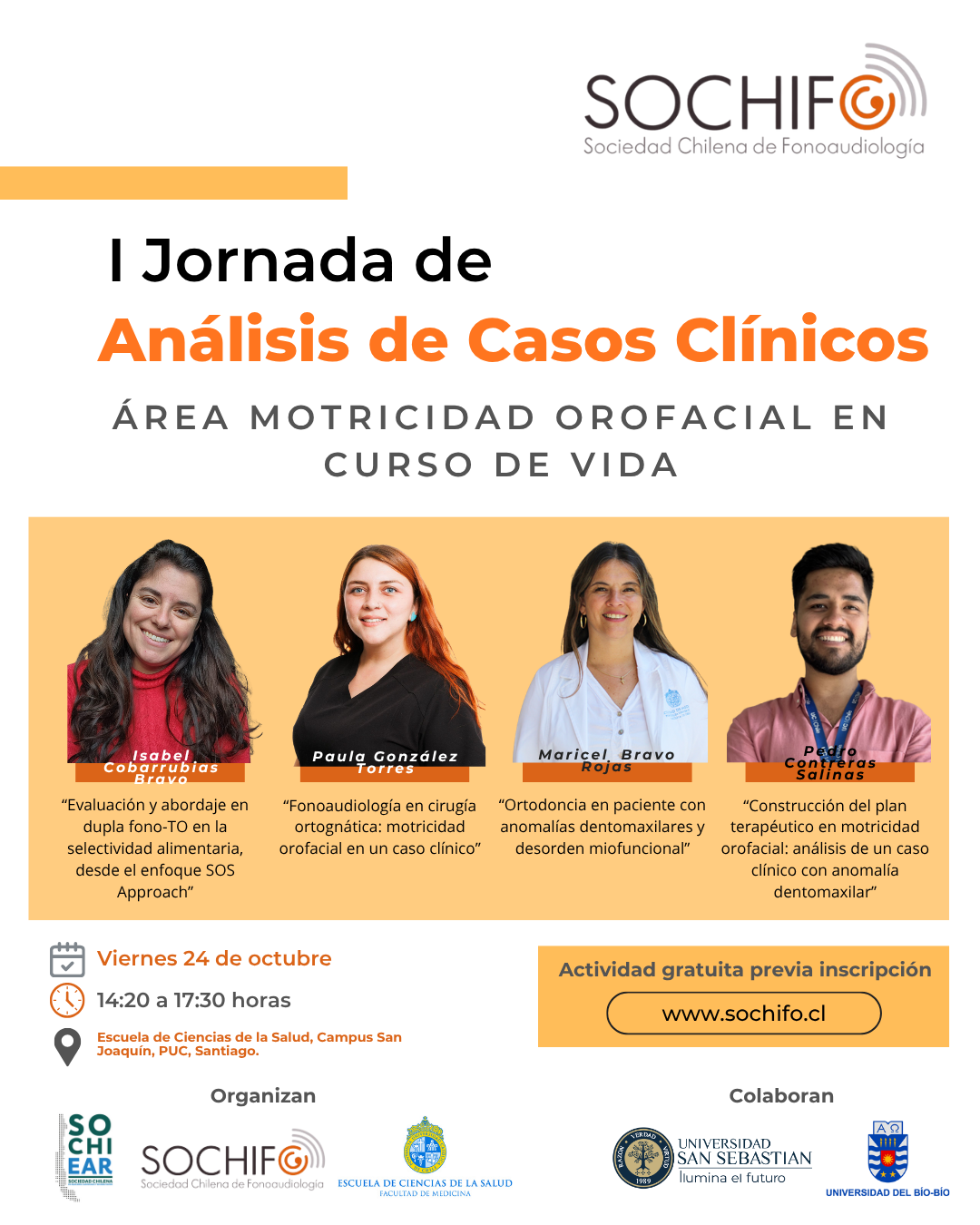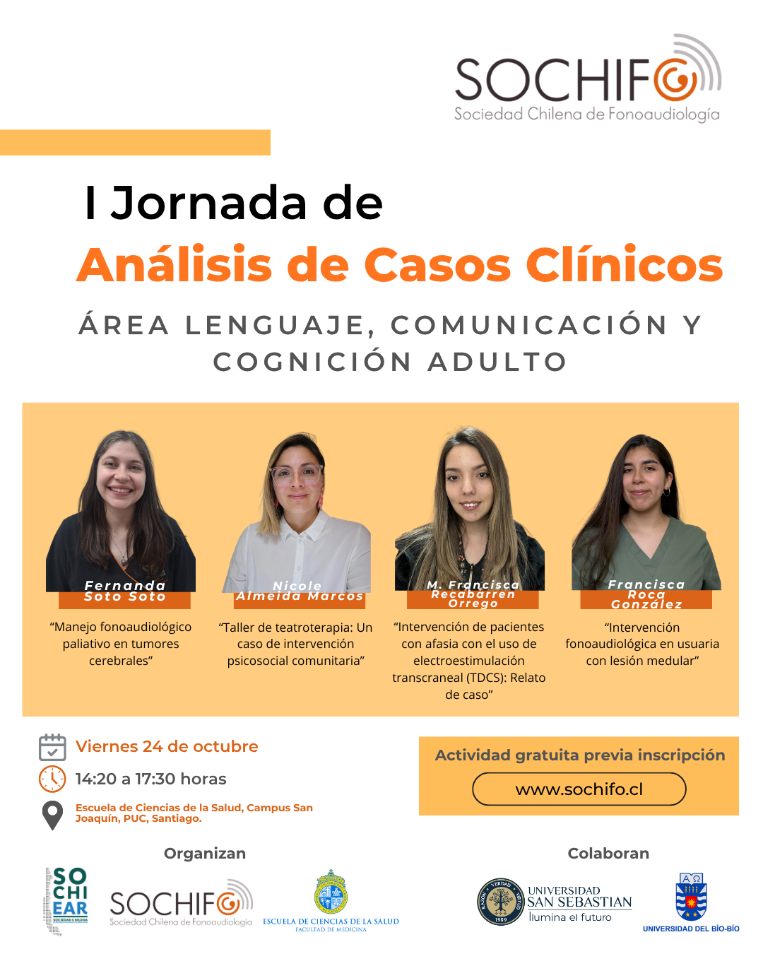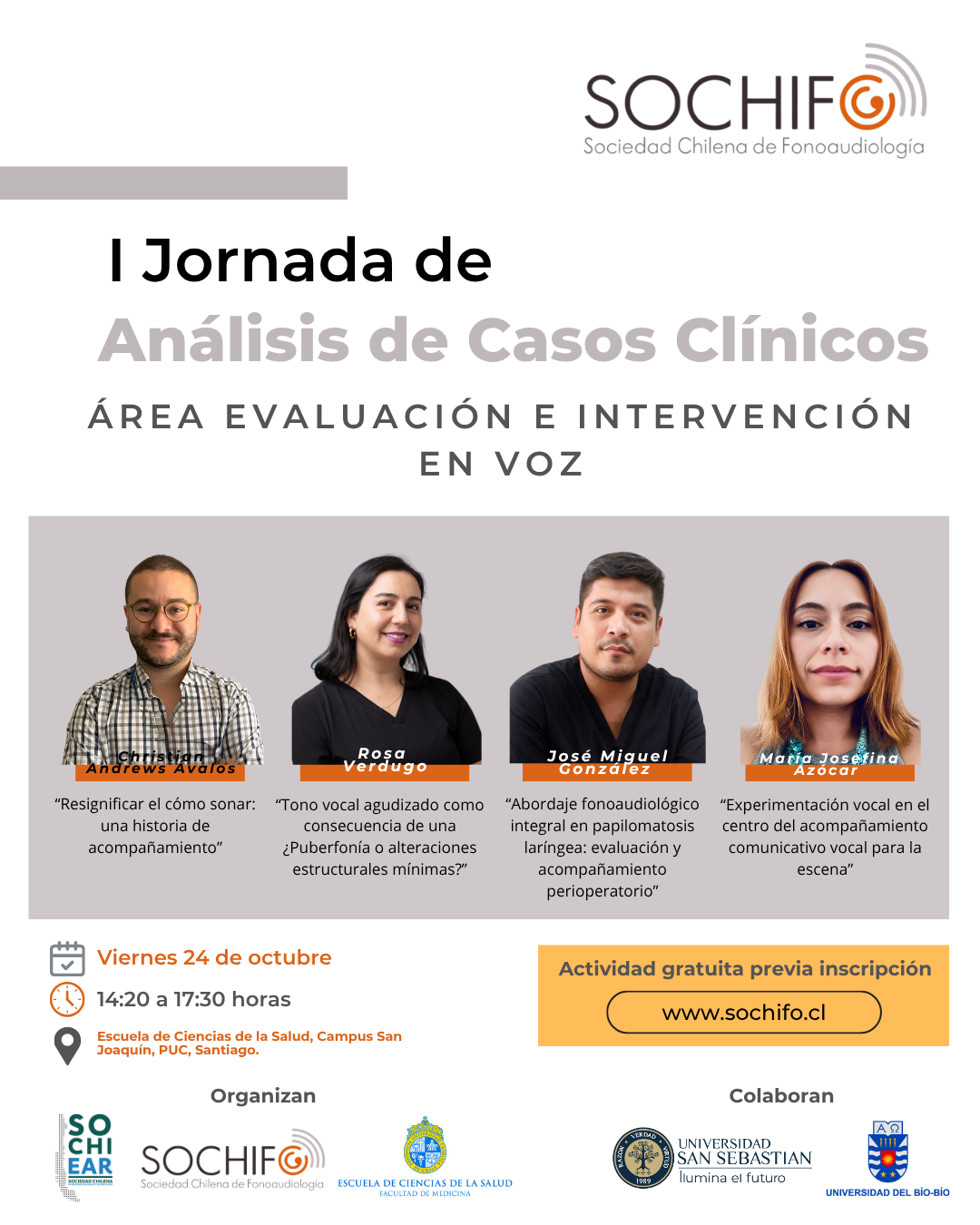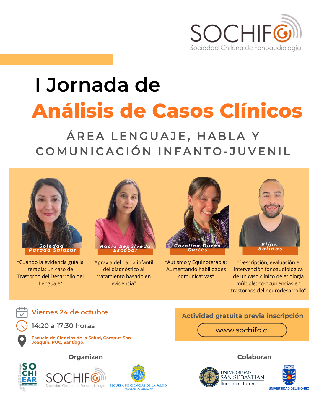 La Sociedad Chilena de Fonoaudiología (SOCHIFO) realizará su Primera Jornada de Casos Clínicos: “Práctica Fonoaudiológica Basada en Evidencia”, el viernes 24 de octubre de 2025, entre 14:30 y 17:30 horas, en la Escuela de Ciencias de la Salud del Campus San Joaquín de la Pontificia Universidad Católica de Chile.