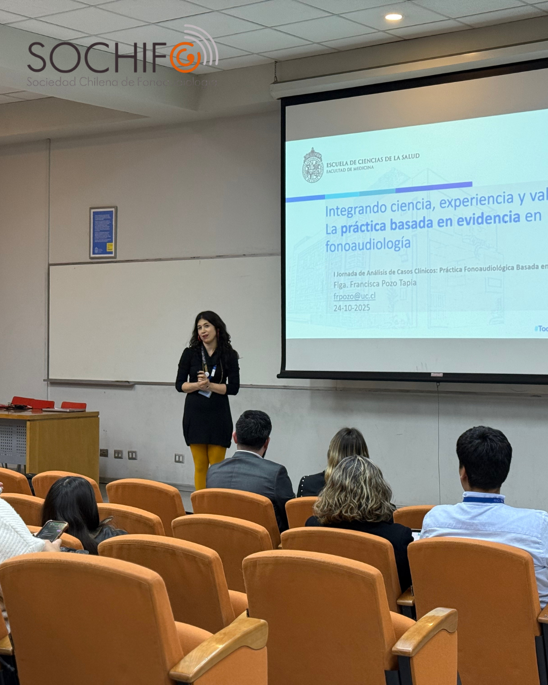 En la Escuela de Ciencias de la Salud del Campus San Joaquín (PUC), la Sociedad Chilena de Fonoaudiología (SOCHIFO) realizó con éxito, el viernes 24 de octubre y en modalidad presencial, la I Jornada de Casos Clínicos: “Práctica Fonoaudiológica Basada en Evidencia” organizada en colaboración con SOCHIEAR, Fonoaudiología UC, Universidad San Sebastián y Universidad del Bío-Bío. La actividad congregó a profesionales y estudiantes avanzados/as para revisar, con enfoque científico, procesos de evaluación, diagnóstico, intervención y resultados clínicos.